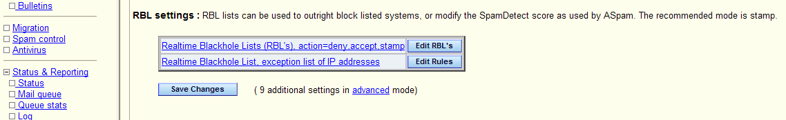 If you click on the advanced mode in the web admin you can look for (do late disconnect - g_orbs_late) This means that the your users are allowed to authenticate first and then the RBL checks are done, this means that if your users are on a RBL they will still be able to send messages through your server. This can also be used with the setting g_spf_skip_to which allows you to add recipients that will be bypassed for RBL checks, so you might add postmaster in here as everyone should be able to send to postmaster.
